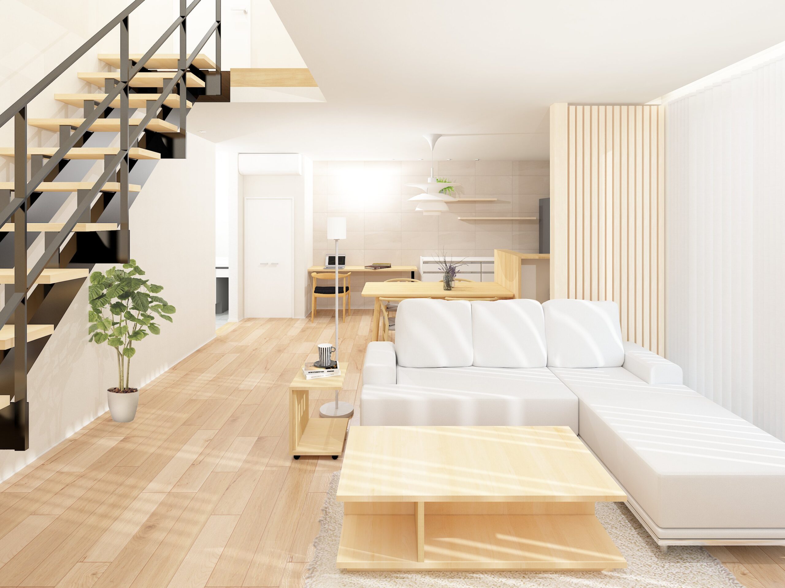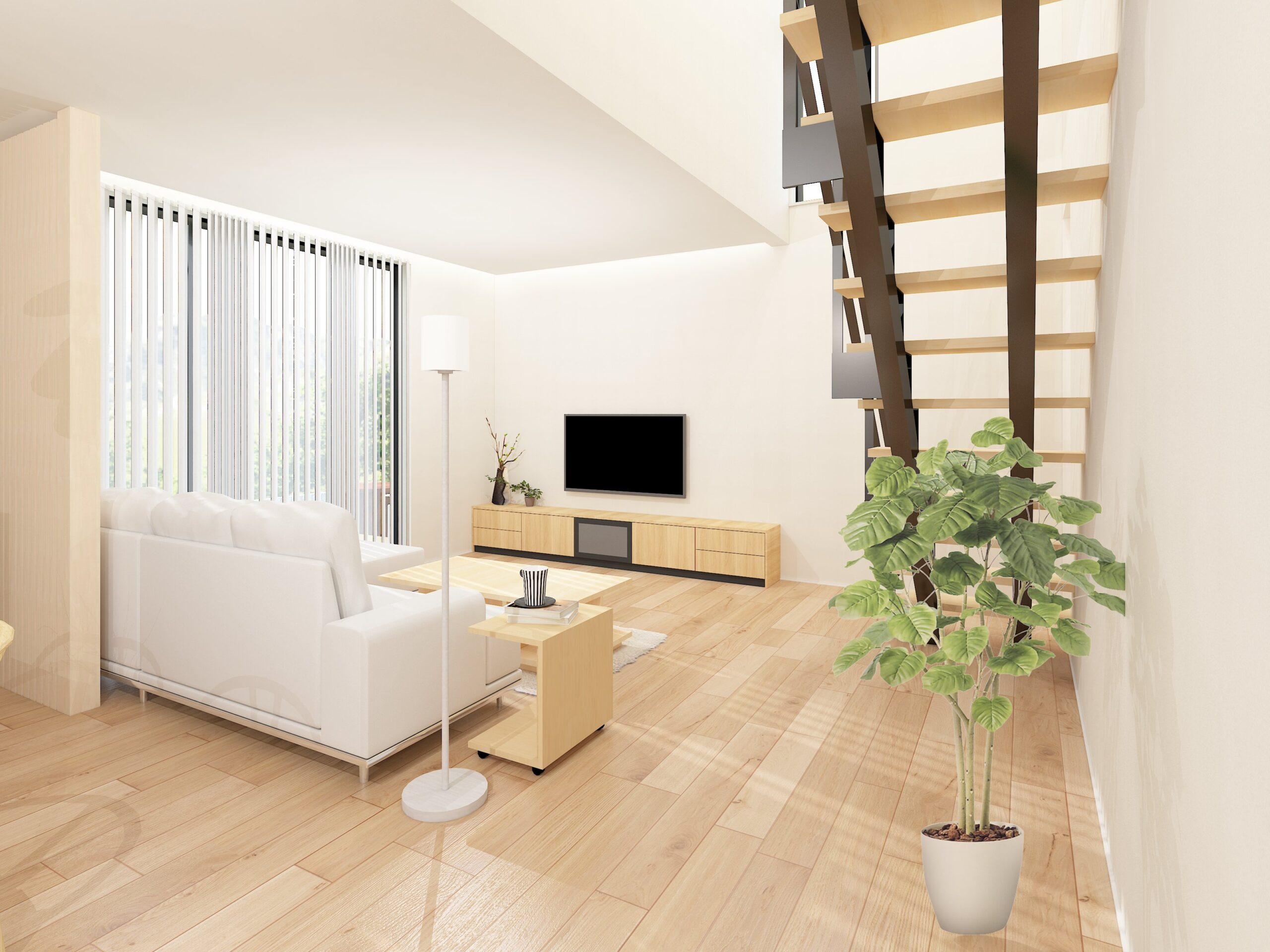 24帖のLDKに吹き抜けと鉄骨階段。大きな窓にウッドデッキ付きで暮らしの風景が見えてくる。